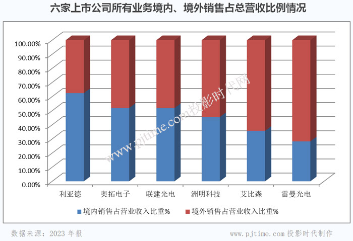 近年來(lái),各頭部LED顯示屏企明顯加大了海外市場(chǎng)拓展。2023年財(cái)報(bào)顯示,艾比森、奧拓電子連續(xù)3年海外業(yè)績(jī)?cè)鲩L(zhǎng),大部分企業(yè)開(kāi)始加強(qiáng)亞、非、拉等新興市場(chǎng)的拓展力度。洲明科技始終堅(jiān)持市場(chǎng)營(yíng)銷體系的全球化布局,目前營(yíng)銷網(wǎng)絡(luò)已覆蓋160多個(gè)國(guó)家,與 5400多家經(jīng)銷商達(dá)成合作,成立 20余家海外分子公司及辦事處。通過(guò)積極拓展海外市場(chǎng),洲明科技持續(xù)在海外標(biāo)桿項(xiàng)目和國(guó)際市場(chǎng)新興需求方面取得進(jìn)展,實(shí)現(xiàn)了數(shù)量和質(zhì)量的雙豐收。雷曼光電2023年顯示業(yè)務(wù)境外實(shí)現(xiàn)營(yíng)業(yè)收入4.11億元,占公司顯示板塊總營(yíng)收57%。奧拓電子海外市場(chǎng)實(shí)現(xiàn)營(yíng)業(yè)收入31,628.20萬(wàn)元,同比增長(zhǎng)9.54%,連續(xù)三年保持增長(zhǎng)。聯(lián)建光電LED顯示業(yè)務(wù)2023年海外實(shí)現(xiàn)營(yíng)收4.72億元,占營(yíng)業(yè)收入的48.14% 。艾比森2023年海外占總營(yíng)收約64%。利亞德以國(guó)內(nèi)市場(chǎng)起家,近年也逐步擴(kuò)大海外市場(chǎng)占比。