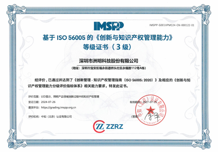 近日,洲明科技榮獲ISO 56005創(chuàng)新與知識產(chǎn)權(quán)管理能力三級評價證書,成為LED顯示行業(yè)全國首家獲此證書的企業(yè)。
