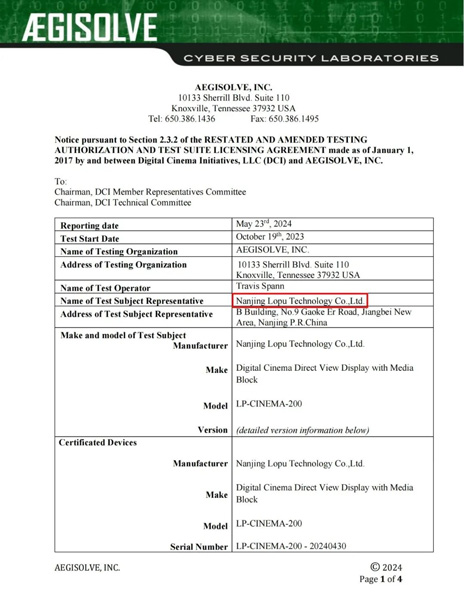 2024年8月1日,再度傳來喜訊:南京洛普全球首款 20米4K 全透聲LED電影屏成功通過DCI認證!