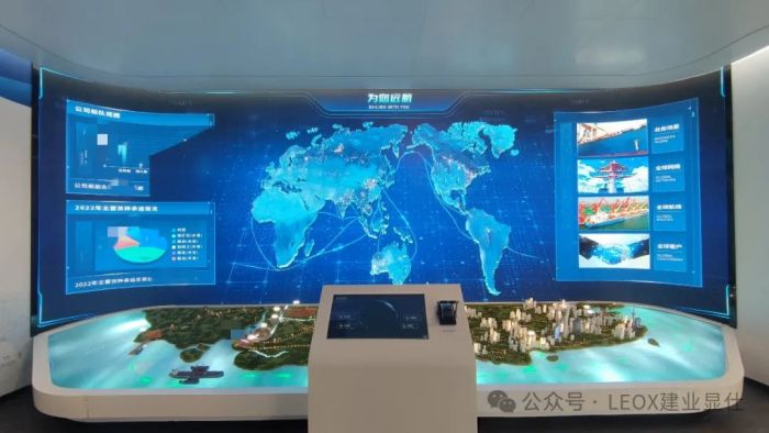 在廣州中遠(yuǎn)國(guó)際航運(yùn)大廈企業(yè)展廳項(xiàng)目中,LEOX建業(yè)顯仕為其提供了全域顯示解決方案,展廳主屏采用LEOX顯仕P2模組拼接而成的7m*2m超大尺寸超高清顯示屏,擁有高達(dá)3520*1120的分辨率,細(xì)膩呈現(xiàn)每一個(gè)細(xì)節(jié),能夠以震撼的視覺(jué)效果展示企業(yè)的宣傳視頻、圖片和數(shù)據(jù)。