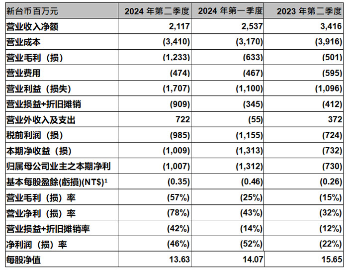 瀚宇彩晶股份有限公司近日公布 2024 年第二季財報。 第二季營收凈額約為新臺幣(下同)21.17 億元,較 2024 年第㇐季 25.37 億元減少 14%,較去年同期34.16億元減少38%。 營業(yè)毛利約為虧損12.33 億元,營業(yè)損失約為 17.07 億元,本期凈損約為 10.09 億元,本期歸母凈利潤為虧損10.07億元。