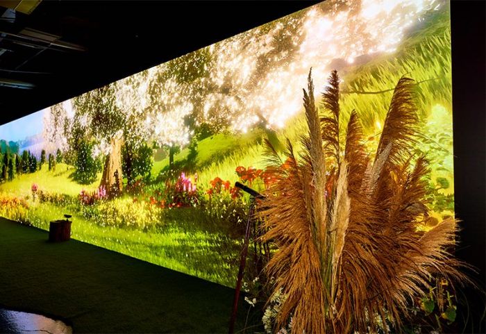 Hero NYC沉浸式體驗館8月份正在利用該大屏舉行主題為《BLOOM: 紐約被遺忘的伊甸園的秘密奇跡》展覽,創(chuàng)新數(shù)字藝術(shù)裝置讓參觀者踏上從種子到綻放的旅程,潛入相互關(guān)聯(lián)的自然世界。該展覽包括七個不同的空間,展示了植物種子從生根到開花的整個過程。體驗者一進(jìn)入展覽,便會受到“地球母親”虛擬形象的歡迎,隨后進(jìn)入充滿綠意的空間,在一面18米長的奧拓電子LED視頻墻上觀看六分鐘的視頻。視頻慢慢切換紐約州的生動自然環(huán)境,伴隨鳥鳴、微風(fēng)和流水的背景音效,呈現(xiàn)出詩一般引人場景。在每個場景中,都提供獨特的感官體驗,點燃好奇心,慶祝人與自然之間的共生關(guān)系,例如觀眾還可通過動作控制花瓣雨在屏幕上飄落,就像走進(jìn)真實的大自然一樣身臨其境。