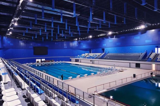 奧體中心游泳館為甲級(jí)中型游泳館,建筑面積約4.7萬平方米,容納座位約1577個(gè)。主要配置包括游泳、跳水等項(xiàng)目的訓(xùn)練館和比賽大廳,并計(jì)劃配套近萬平方米水上親子樂園。