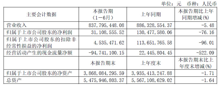 報告期內(nèi),杉杉股份實現(xiàn)營業(yè)收入881,985.60萬元,同比下降6.84%;實現(xiàn)歸屬于上市公司股東的凈利潤1,757.45萬元,同比下降98.27%;實現(xiàn)歸屬于上市公司股東的扣除非經(jīng)常性損益后的凈利潤2,390.64萬元,同比下降95.93%。