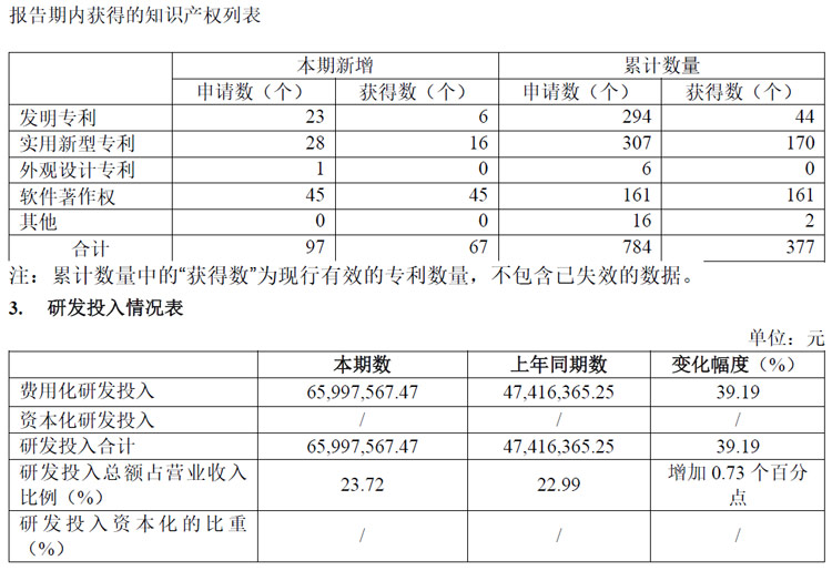 截至報告期末,研發(fā)投入占比達到23.72%,研發(fā)人員占比達到25.51%,公司已獲得發(fā)明專利46項(包含在中國臺灣擁有2項發(fā)明專利)、實用新型專利170項和軟件著作權161項。