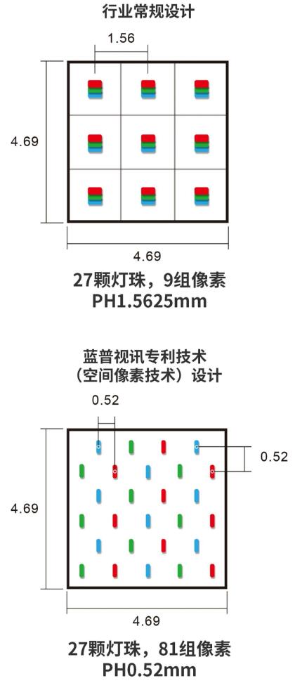 像素間距Pixel Pitch (mm),又稱點(diǎn)間距,指兩顆像素中心點(diǎn)之間的距離,常用P加距離表示,有時(shí)為強(qiáng)調(diào)顯示屏高清特性也有用PH加距離表示,一般以毫米為單位,并且與分辨率和屏幕尺寸密切相關(guān)。以P1.25(也作PH1.25)為例,表示像素距離約為1.25mm。較大的像素間距意味著單位面積內(nèi)像素點(diǎn)更少,分辨率更低;而較小的像素間距則能帶來更高的圖像分辨率和更好的視覺質(zhì)量。藍(lán)普視訊空間像素技術(shù)則可以在單位面積內(nèi)組成更多的像素點(diǎn),提高分辨率。