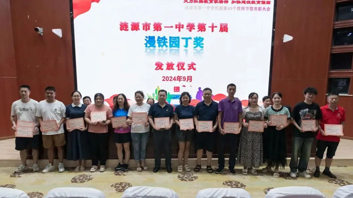 姚毅副校長宣讀了獲得第十屆漫鐵園丁獎(jiǎng)的教師名單,學(xué)校領(lǐng)導(dǎo)受李漫鐵校友委托,給獲獎(jiǎng)教師頒獎(jiǎng),將大會(huì)氣氛推向了高潮。