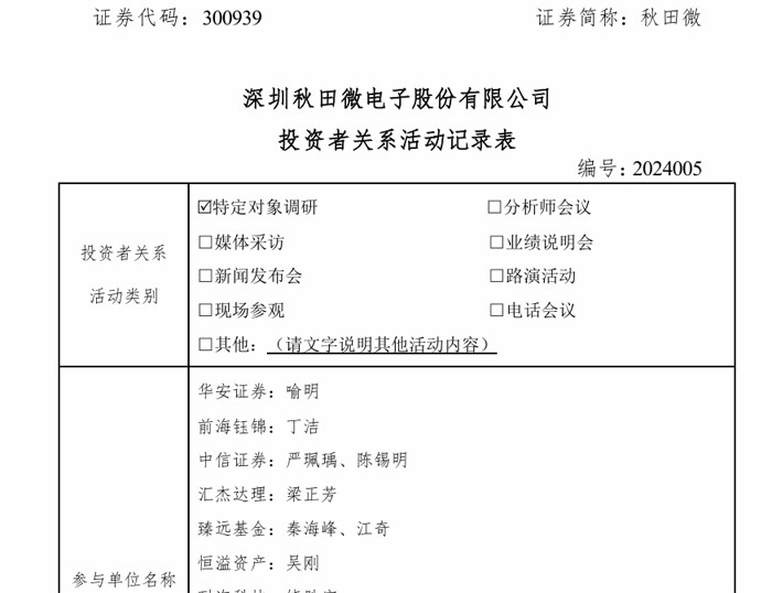 近日,深圳秋田微電子股份有限公司接受華安證券、前海鈺錦、中信證券、匯杰達(dá)理、臻遠(yuǎn)基金、恒溢資產(chǎn)、耐邇科技、遠(yuǎn)東宏信、紅貓資管、方圓金鼎、鼎華資管等機(jī)構(gòu)和個人調(diào)研時,透露了公司在研項(xiàng)目“電子紙膜片和模組”進(jìn)展情況。