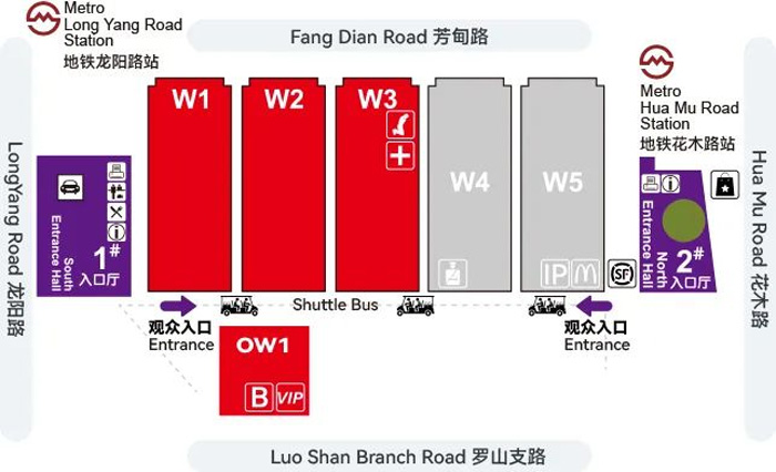 “花木路”站 - 地鐵7號(hào)線 ,步行15分鐘至北廳2號(hào)觀眾登記處。隨后在W5館前乘坐免費(fèi)穿梭巴W1館參觀。