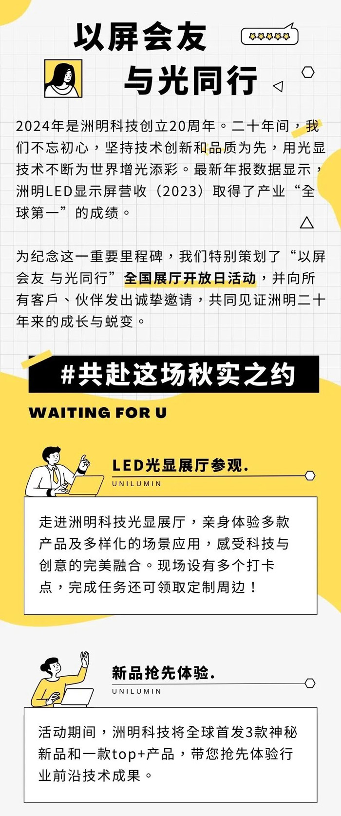 為紀(jì)念這一重要里程碑,洲明特別策劃了“以屏?xí)?與光同行”全國展廳開放日活動,并向所有客戶、伙伴發(fā)出誠摯邀請,共同見證洲明二十年來的成長與蛻變。