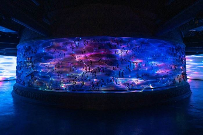 踏入景區(qū)恩澤樓內(nèi),宛若時(shí)光錯(cuò)動(dòng),穿越回千年前島上漁家的各異風(fēng)情!鹅`箸湄洲》表演在此精彩亮相,借助Vivitek(麗訊)工程投影機(jī),以總長(zhǎng)24米、高2.4米的崖刻建筑為幕,在炫彩光影的映射下,呈現(xiàn)出“海上和平女神”媽祖庇佑湄洲島后,百姓安居樂業(yè)的繁榮景象。光影、壁畫和沉浸式展演,人景互動(dòng),亦真亦幻,帶來聽覺、視覺感官多元化的深度觀賞體驗(yàn)。