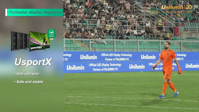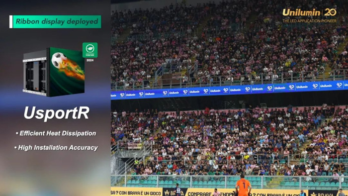 應(yīng)用于倫佐·巴爾貝拉球場的看臺屏UsportR系列,則憑借輕薄設(shè)計與簡潔的安裝結(jié)構(gòu),完美融入球場建筑,營造更具感染力的現(xiàn)場氛圍。產(chǎn)品獨特的上維護設(shè)計更加節(jié)省維護成本,單箱僅重19.5kg的輕薄箱體支持單人輕松維護。其雙面灌膠模組與防積水設(shè)計,確保產(chǎn)品在惡劣氣候下依然穩(wěn)定運行,為球迷提供持續(xù)流暢的視覺體驗。
