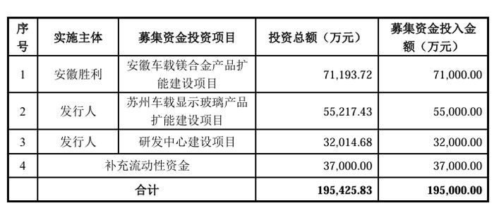 12月26日,蘇州勝利精密制造科技股份有限公司公告擬向特定對(duì)象發(fā)行A股股票募集資金總額不超過19.5億元,擬投入安徽車載鎂合金產(chǎn)品擴(kuò)能建設(shè)項(xiàng)目、蘇州車載顯示玻璃產(chǎn)品擴(kuò)能建設(shè)項(xiàng)目、研發(fā)中心建設(shè)項(xiàng)目及補(bǔ)充流動(dòng)資金。