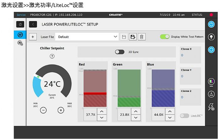 LiteLOC 配備內(nèi)置的顏色亮度傳感器 CSB,實時精準監(jiān)測放映機的輸出亮度及顏色參數(shù)(Cx,Cy,Cz)。