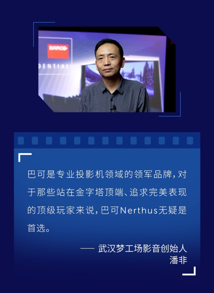本次項(xiàng)目的執(zhí)行方——武漢夢(mèng)工場(chǎng)影音創(chuàng)始人潘非先生表示:“姜先生最看重視覺效果,一開始我們就確定了頂天立地的240英寸巨幕。緊接著,投影機(jī)的亮度成為我們考慮的重點(diǎn),普通投影機(jī)顯然無(wú)法提供足夠的亮度,特別是在呈現(xiàn) HDR 畫面時(shí)。經(jīng)過(guò)多次挑選和討論,我們一致決定選擇巴可 Nerthus 這款旗艦級(jí)產(chǎn)品。它最打動(dòng)客戶的不僅是超高亮度,還有大色域和高對(duì)比度,完美解決了家庭影院中亮度與色彩的矛盾,可以說(shuō)在畫質(zhì)上毫不妥協(xié)。”
