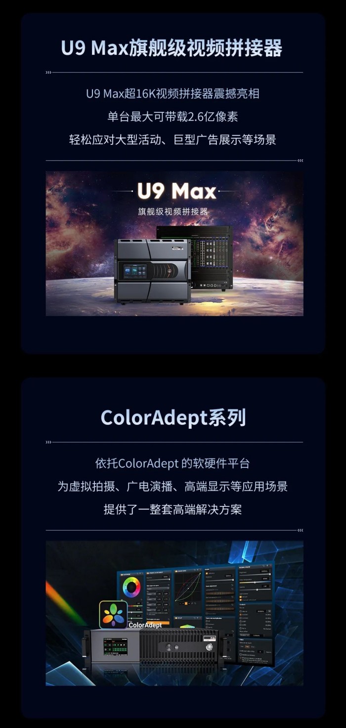 U9 Max超16K視頻拼接器震撼亮相,單臺最大可帶載2.6億像素,輕松應對大型活動、巨型廣告展示等場景。