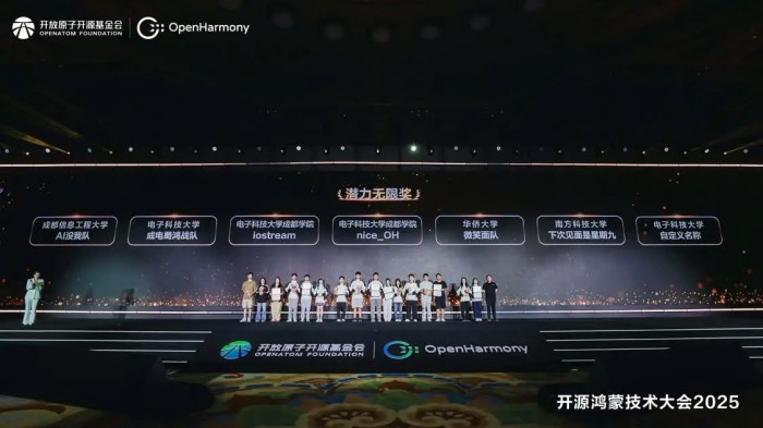 開源鴻蒙項(xiàng)目群工作委員會執(zhí)行主席章曉峰為獲獎(jiǎng)賽隊(duì)頒發(fā)潛力無限獎(jiǎng)