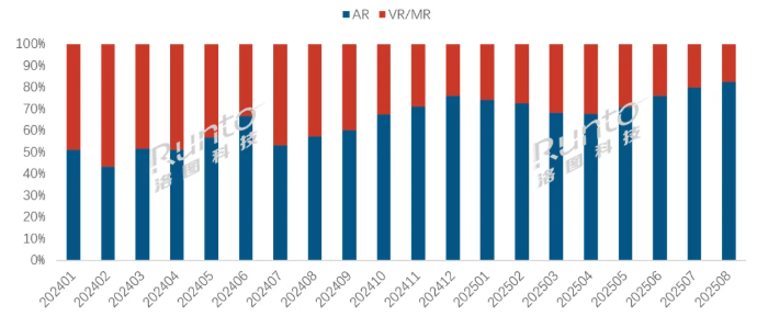 至今年8月,VR/MR設(shè)備在線上XR設(shè)備市場的月度占比已從2024年初的五成降至不足兩成。