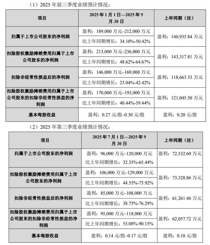 從單季度表現(xiàn)來看,2025 年 7 月 - 9 月(第三季度),歸母凈利潤預計為 9.6 億元 - 12 億元,較上年同期 7.25 億元增長 32.35%-65.44%;扣除股權(quán)激勵攤銷費用后,該指標預計達 10.6 億元 - 12.9 億元,同比增幅 44.55%-75.92%?鄯呛髢衾麧櫛憩F(xiàn)更為突出,預計為 8.5 億元 - 10.8 億元,較上年同期 6.13 億元增長 38.75%-76.29%;若疊加扣除股權(quán)激勵攤銷費用,該指標預計為 9.5 億元 - 11.8 億元,同比激增 53.08%-90.15%,單季增長動能顯著。