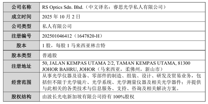 根據(jù)公司規(guī)劃,睿思光學(xué)將成為公司未來(lái)在馬來(lái)西亞投資新建精密光學(xué)產(chǎn)線的實(shí)施主體。睿思光學(xué)基本信息登記如下: