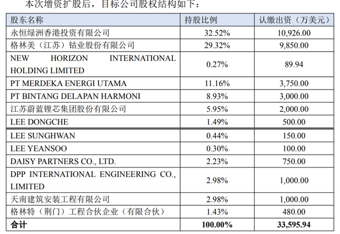公告顯示,本次增資擴(kuò)股的目標(biāo)公司成立于 2023 年 11 月,注冊(cè)資本原為 9939.94 萬(wàn)美元,增資后將增至 33595.94 萬(wàn)美元,股權(quán)結(jié)構(gòu)由 “格林美系” 全資持股轉(zhuǎn)為多方法人共同持股。其中,蔚藍(lán)鋰芯以現(xiàn)金方式(資金來(lái)源為自有或自籌資金)認(rèn)購(gòu) 2000 萬(wàn)股普通股,對(duì)應(yīng)持股比例 5.95%。