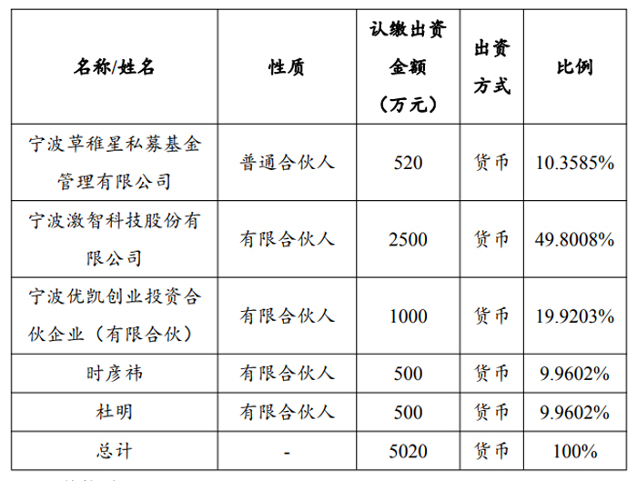 從各合伙人認(rèn)繳出資結(jié)構(gòu)來(lái)看,基金出資方涵蓋專業(yè)機(jī)構(gòu)、上市公司及自然人,具體分配如下:作為普通合伙人的寧波草稚星私募基金管理有限公司認(rèn)繳出資 520 萬(wàn)元,占比 10.3585%,承擔(dān)基金管理職責(zé);激智科技作為有限合伙人,以 2500 萬(wàn)元認(rèn)繳金額占據(jù) 49.8008% 的出資比例,為基金第一大有限合伙人;此外,寧波優(yōu)凱創(chuàng)業(yè)投資合伙企業(yè)(有限合伙)、自然人時(shí)彥祎及杜明分別以 1000 萬(wàn)元、500 萬(wàn)元、500 萬(wàn)元認(rèn)繳出資,對(duì)應(yīng)出資比例為 19.9203%、9.9602%、9.9602%,各方均以貨幣形式完成出資。