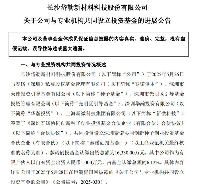 據(jù)悉,岱勒新材早在 2025 年 5 月 26 日便已聯(lián)合多方專業(yè)機(jī)構(gòu)啟動(dòng)基金設(shè)立工作。當(dāng)時(shí)公司與泰諾(深圳)私募股權(quán)基金管理有限公司(下稱 “泰諾資本”)、深圳市天使投資引導(dǎo)基金有限公司(下稱 “種子基金”)、深圳市光明區(qū)引導(dǎo)基金投資管理有限公司(下稱 “光明區(qū)引導(dǎo)基金”)、深圳華瀚投資有限公司(下稱 “華瀚投資”)及上海新微科技集團(tuán)有限公司(下稱 “新微科技”)共同簽署《合伙協(xié)議》,擬聯(lián)合設(shè)立泰諾創(chuàng)投基金。根據(jù)協(xié)議約定,該基金認(rèn)繳出資總額為 16330.00 萬(wàn)元,其中岱勒新材作為有限合伙人,以自有資金出資 1000 萬(wàn)元,占基金認(rèn)繳總額的 6.12%。