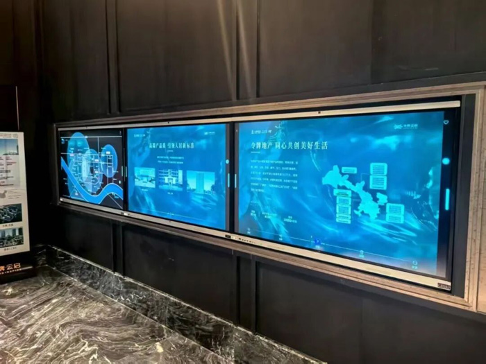 進(jìn)入該項(xiàng)目營銷大廳,由3塊AOC 65T14MC組合而成的信息展示和查詢大屏,以直觀、生動的形式向客戶展示項(xiàng)目的位置、優(yōu)勢、配套、戶型等核心信息,實(shí)現(xiàn)了“分屏介紹”的全新展示模式。