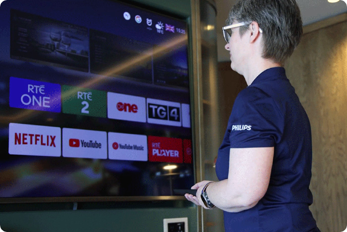 Michael Brennan,酒店董事總經(jīng)理:“MediaSuite電視滿足了我們?yōu)榭腿怂璧囊磺校撼錾漠嬞|(zhì)、全新的客信系統(tǒng)、內(nèi)置投屏功能,以及與物業(yè)管理系統(tǒng)的高效鏈接!