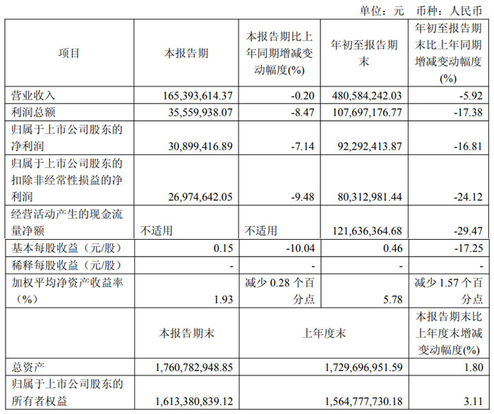 若拉長至年初至報告期末(1-9 月),公司累計營收 4.81 億元,同比降幅擴大至 5.92%;累計利潤總額 1.08 億元,同比下降 17.38%;累計歸母凈利潤 9229.24 萬元,同比下滑 16.81%,業(yè)績端的同比壓力持續(xù)顯現(xiàn)。