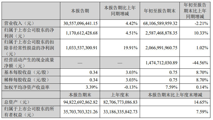 此外,前三季度基本每股收益與稀釋每股收益均為 0.75 元 / 股,同比增長 8.70%,股東回報穩(wěn)步提升;截至 9 月末,公司總資產達 948.23 億元,較上年末增長 14.65%,歸屬于上市公司股東的所有者權益 357.04 億元,較上年末增長 7.59%,資產規(guī)模與股東權益同步擴張,財務基礎持續(xù)夯實。