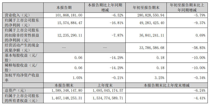 截至報告期末,公司總資產為 24.68 億元,較上年度末的 26.38 億元下降 6.43%;歸屬于上市公司股東的所有者權益為 15.76 億元,較上年末減少 3.65%,資產規(guī)模變動主要受資金結構調整影響。