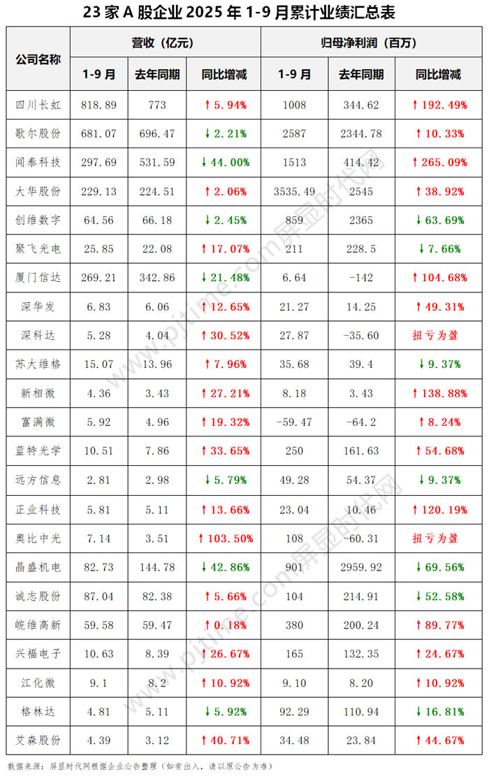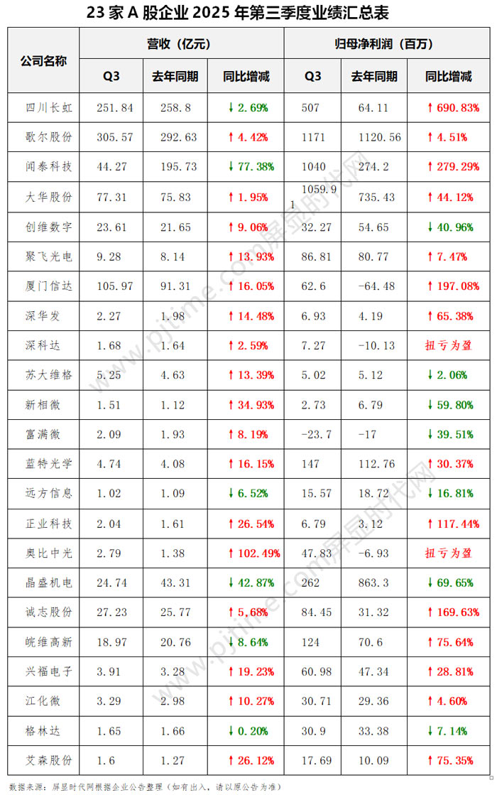 10月24日晚間,四川長虹、 歌爾股份、聞泰科技、大華股份、創(chuàng)維數(shù)字、 聚飛光電、廈門信達、深華發(fā)、深科達、蘇大維格、新相微、富滿微、藍特光學、遠方信息、正業(yè)科技、 奧比中光、晶盛機電、誠志股份、皖維高新、興福電子、江化微、格林達、艾森股份23家A股上市公司密集發(fā)布2025年第三季度財報。涉及智能電視、LED、xR、光學與半導體、顯示裝備與材料等領域企業(yè)。