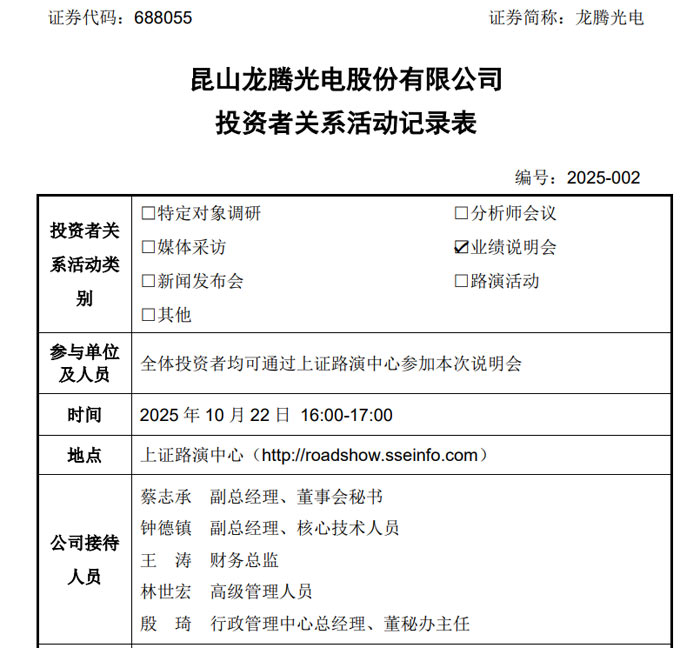 近日,昆山龍騰光電股份有限公司(證券簡稱:龍騰光電)在上證路演中心召開 2025 年半年度業(yè)績說明會。公司副總經理兼董事會秘書蔡志承、副總經理兼核心技術人員鐘德鎮(zhèn)、財務總監(jiān)王濤等管理層出席會議,圍繞電子紙進展、海外產線布局、研發(fā)投入、營收應對等核心議題,與全體投資者進行深度互動,全面披露公司經營動態(tài)與未來規(guī)劃。