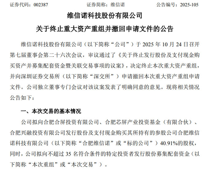 2025 年 10 月 24 日,維信諾科技股份有限公司(證券代碼:002387,證券簡稱:維信諾)召開第七屆董事會第二十六次會議,審議通過終止發(fā)行股份及支付現(xiàn)金購買資產(chǎn)并募集配套資金暨關聯(lián)交易事項的議案,決定終止本次重大資產(chǎn)重組并向深圳證券交易所(以下簡稱 “深交所”)申請撤回相關申請文件。公司獨立董事已就該議案發(fā)表明確同意意見,相關事項后續(xù)尚需提交股東大會審議。
