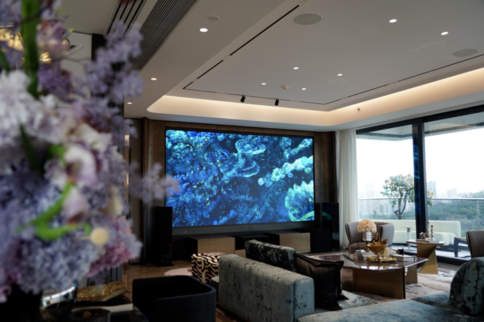 中麒將極致的影院視覺體驗(yàn),延伸至居家生活的方寸之間。為天驕國際的云端樣板房定制了一套163英寸的COB巨幕家庭影院解決方案。