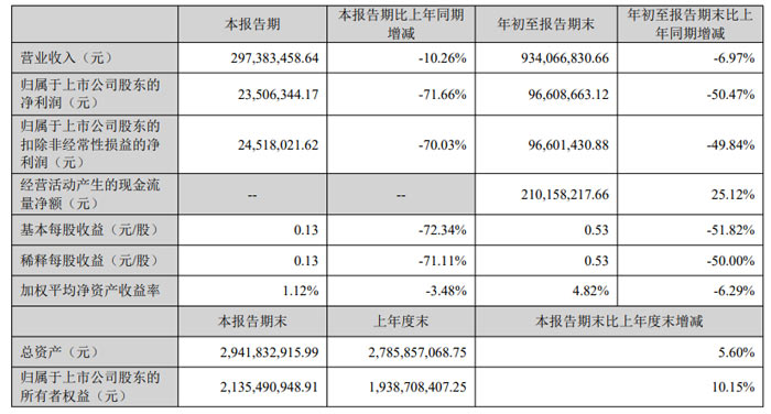 盈利水平:本季度歸屬于上市公司股東的凈利潤(rùn) 23,506,344.17 元(約 2350.63 萬(wàn)元),同比降幅 71.66%;累計(jì)凈利潤(rùn) 96,608,663.12 元(約 9660.87 萬(wàn)元),同比下降 50.47%;扣除非經(jīng)常性損益后,累計(jì)凈利潤(rùn) 96,601,430.88 元,同比下降 49.84%,利潤(rùn)下滑主要系收入減少及對(duì)應(yīng)成本波動(dòng)所致。