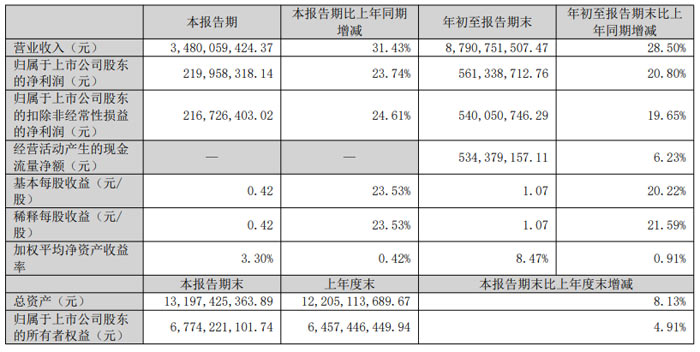從年初至報告期末(1-9 月),公司整體業(yè)績更趨穩(wěn)。豪塾嫚I業(yè)收入 87.91 億元,同比增長 28.50%;累計歸母凈利潤 5.61 億元,同比增長 20.80%;累計扣非歸母凈利潤 5.40 億元,同比增長 19.65%。每股收益方面,前三季度基本每股收益 1.07 元 / 股,同比增長 20.22%,稀釋每股收益同步增長 21.59%,股東回報穩(wěn)步提升。