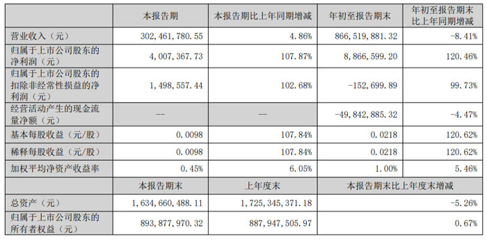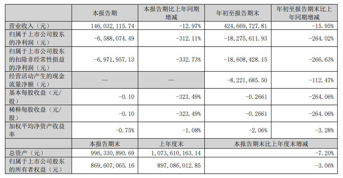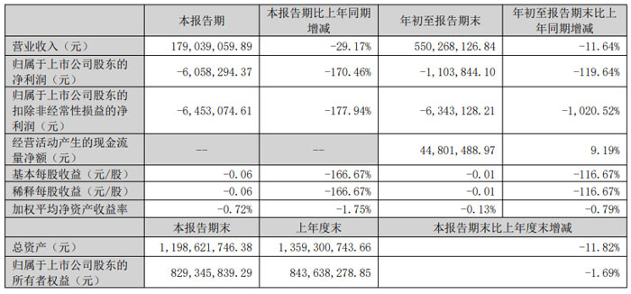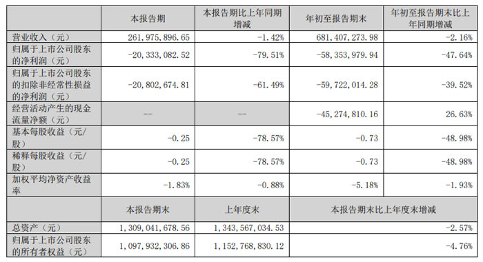 年初至報告期末表現(xiàn):1-9 月累計實現(xiàn)營業(yè)收入 5.50 億元,同比減少 11.64%;歸屬于上市公司股東的凈利潤為 - 110.38 萬元,同比下降 119.64%;扣非后凈利潤為 - 634.31 萬元,同比降幅擴大至 1020.52%。