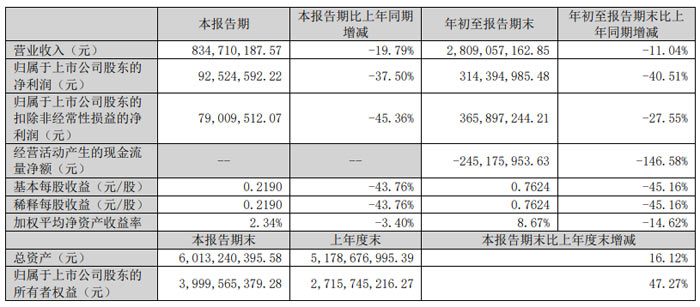 2025 年 1-9 月,公司累計實現(xiàn)營業(yè)收入 28.09 億元,同比下降 11.04%;歸屬于上市公司股東的凈利潤 3.14 億元,同比減少 40.51%;扣非后凈利潤 3.66 億元,同比下降 27.55%;久抗墒找媾c稀釋每股收益均為 0.7624 元 / 股,同比降幅達 45.16%;加權平均凈資產(chǎn)收益率 8.67%,較上年同期減少 14.62 個百分點。報告指出,凈利潤同比下降主要系主營業(yè)務毛利率較上年同期略有調(diào)整所致。