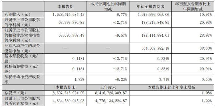 從年初至報告期末(即 2025 年 1-9 月)來看,公司累計實現(xiàn)營業(yè)收入 121.78 億元,較上年同期微降 0.10%,整體規(guī);境制;累計歸屬于上市公司股東的凈利潤 2.09 億元,同比下降 42.36%;扣非后累計凈利潤 2.04 億元,同比下降 42.82%。每股收益方面,年初至報告期末基本每股收益與稀釋每股收益均為 0.14 元 / 股,同比下降 41.67%,與凈利潤降幅基本一致。