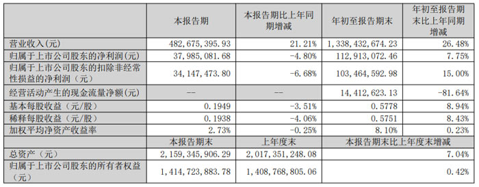 年初至報告期末:邁為股份累計實現(xiàn)營業(yè)收入 62.04 億元,同比減少 20.13%;歸屬于上市公司股東的凈利潤 6.63 億元,同比下降 12.56%;扣非后凈利潤 5.91 億元,同比下降 13.98%;久抗墒找 2.38 元 / 股,同比下降 12.50%。