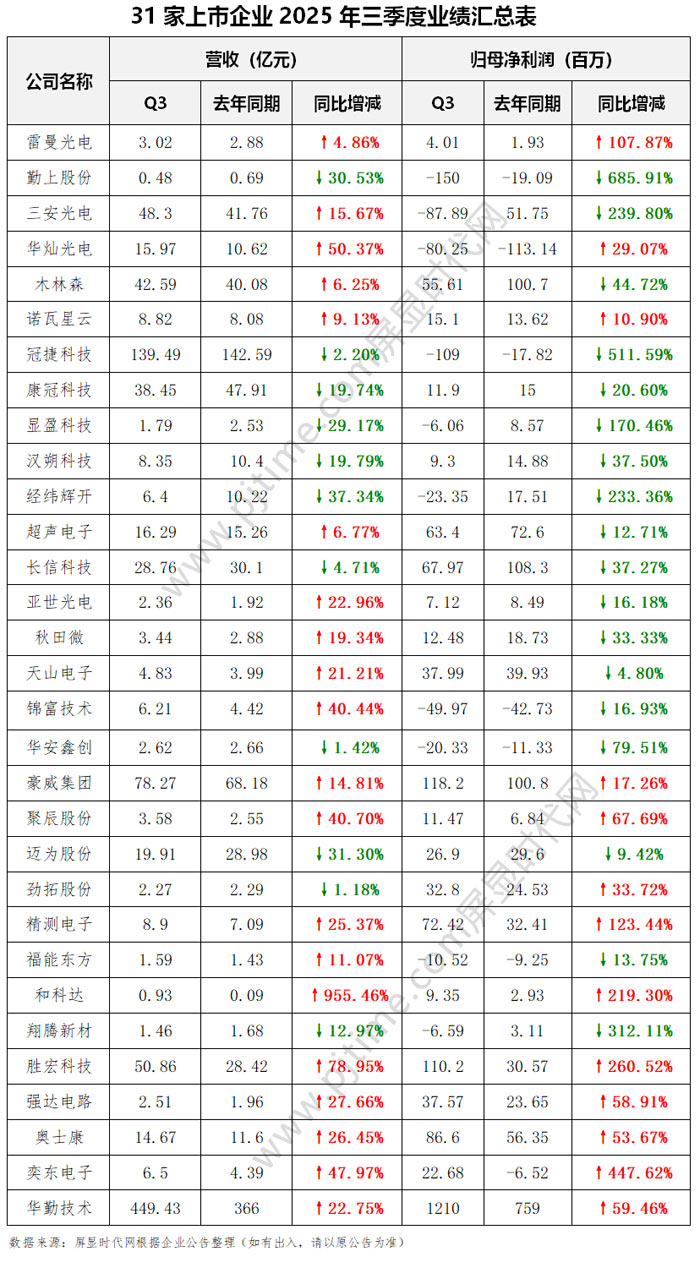 10月28日,雷曼光電、勤上股份、三安光電、京東方華燦光電、木林森、諾瓦星云、冠捷科技、康冠科技、顯盈科技、漢朔科技、經(jīng)緯輝開、超聲電子、長信科技、 亞世光電、秋田微、  天山電子、 錦富技術、華安鑫創(chuàng)、豪威集團、 聚辰股份、邁為股份、勁拓股份、精測電子等31家企業(yè)發(fā)布2025年第三季度財報。涵蓋LED、顯示模組、觸控顯示、電子紙、商顯平板、數(shù)字標牌、顯示驅動與芯片、裝備與材料等領域。