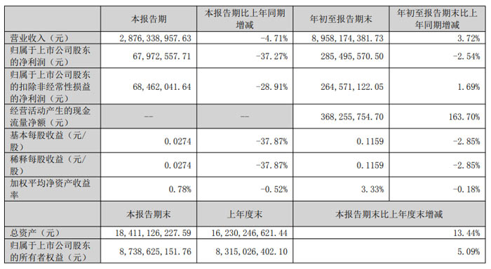 從業(yè)績表現(xiàn)來看,公司本報(bào)告期(2025 年第三季度)實(shí)現(xiàn)營業(yè)收入 28.76 億元,同比下降 4.71%;歸屬于上市公司股東的凈利潤 6797.26 萬元,同比下降 37.27%;扣除非經(jīng)常性損益后的凈利潤 6846.20 萬元,同比下降 28.91%。盡管單季度業(yè)績有所調(diào)整,但年初至報(bào)告期末(2025 年 1-9 月)整體經(jīng)營穩(wěn)健,實(shí)現(xiàn)營業(yè)收入 89.58 億元,同比增長 3.72%;歸屬于上市公司股東的凈利潤 2.85 億元,雖同比微降 2.54%,但扣非后凈利潤 2.65 億元,同比增長 1.69%,核心業(yè)務(wù)盈利能力穩(wěn)步提升。