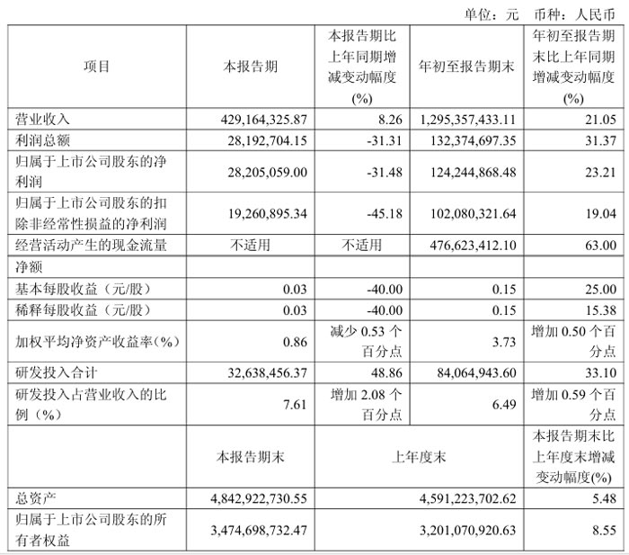 2025 年第三季度,公司實現(xiàn)營業(yè)收入 4.29 億元,較上年同期的 3.97 億元增長 8.26%;歸屬于上市公司股東的凈利潤為 2820.51 萬元,較上年同期的 4116.84 萬元下降 31.48%;歸屬于上市公司股東的扣除非經(jīng)常性損益的凈利潤為 1926.09 萬元,較上年同期的 3513.36 萬元下降 45.18%。