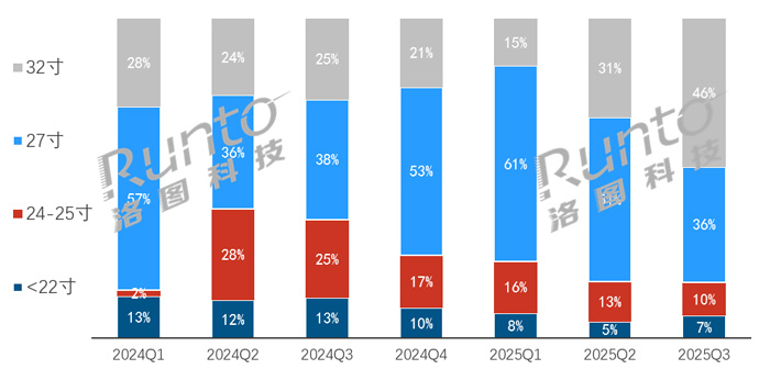 2025年第二季度以來,百度、海信、KTC積極布局32寸4K大屏產(chǎn)品線,隨著眾多新品上市并大賣,根據(jù)洛圖科技(RUNTO)數(shù)據(jù)顯示,2025年第三季度的線上市場中,32寸產(chǎn)品的銷量份額達(dá)到46.4%,較去年同期大幅增長了21.1個百分點(diǎn),成為銷量最高的細(xì)分市場。