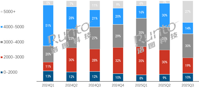 5000+元價格段增長推動市場均價提升,3000元以內(nèi)各價格段份額均萎縮