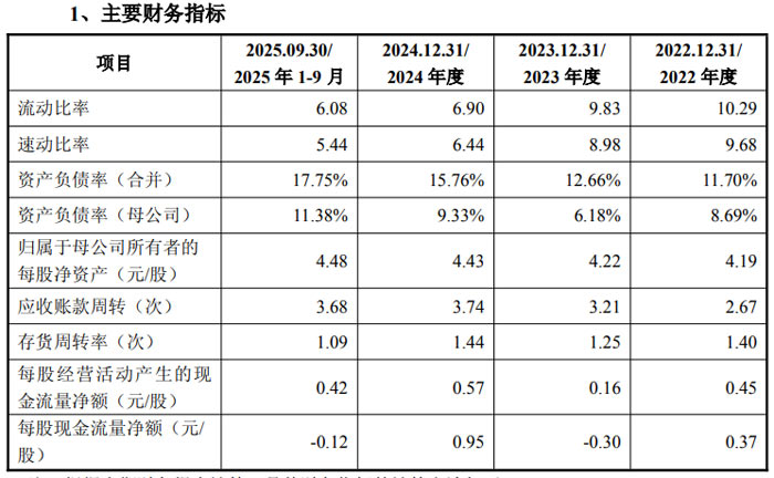 資產(chǎn)結(jié)構(gòu)方面,公司資產(chǎn)總額持續(xù)增長(zhǎng),2025 年 9 月末達(dá)到 21.93 億元,流動(dòng)資產(chǎn)占比超 60%,資產(chǎn)流動(dòng)性良好。截至同期末,公司資產(chǎn)負(fù)債率僅為 17.75%,遠(yuǎn)低于行業(yè)平均水平,償債能力充足。營(yíng)運(yùn)能力上,應(yīng)收賬款周轉(zhuǎn)率逐年提升,體現(xiàn)出公司回款效率的改善。
