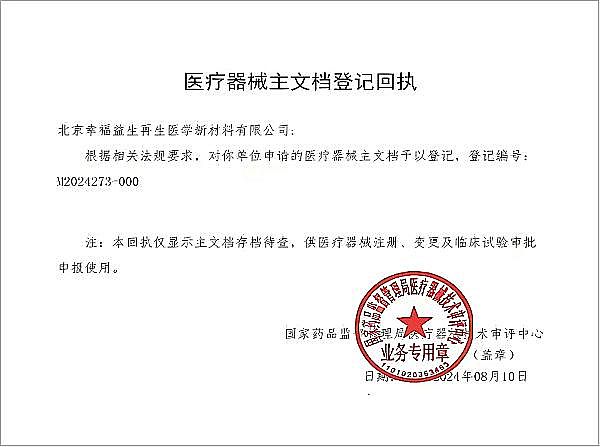 2024年8月,幸福益生成功獲批國家藥監(jiān)局評審中心醫(yī)療器械主文檔登記。醫(yī)療器械主文檔登記旨在建立材料合規(guī)信任體系,為材料供應(yīng)商與醫(yī)療器械制造商搭建“合規(guī)橋梁”,同時降低器械注冊風險、簡化供應(yīng)鏈審核,是材料進入醫(yī)療器械領(lǐng)域的關(guān)鍵合規(guī)支撐。