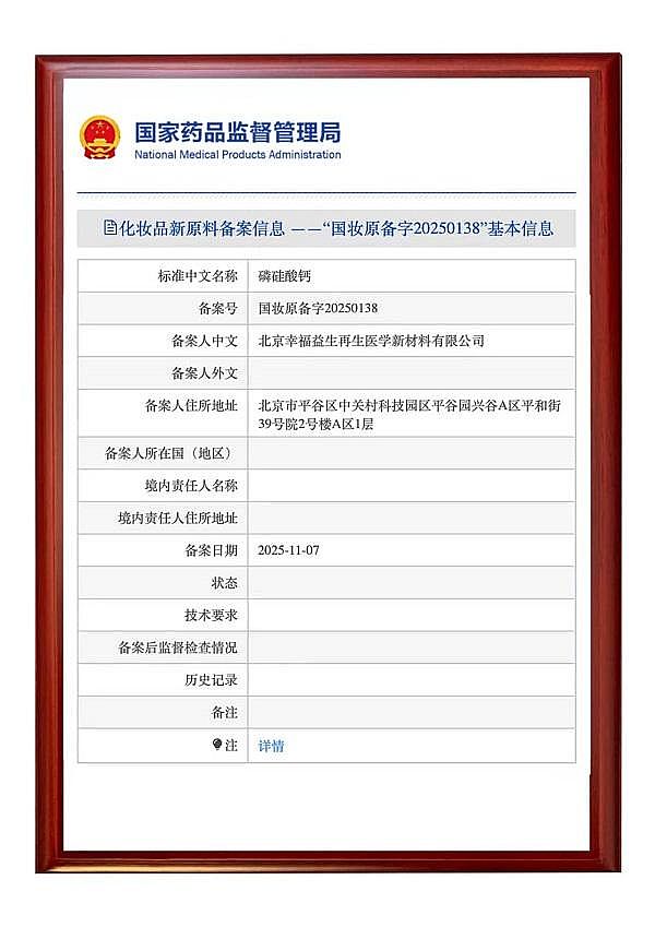 2025年11月7日,“磷硅酸鈣”通過國家藥監(jiān)局化妝品新原料備案(備案號:國妝原備字20250138),成為國內(nèi)少數(shù)通過嚴苛審核的化學合成類化妝品新原料,為功效型護膚品研發(fā)提供“中國原創(chuàng)”核心成分。